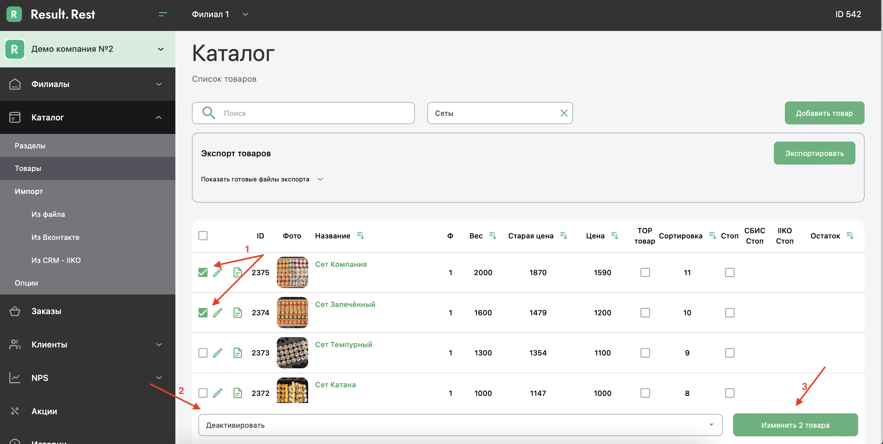 Нажать на чекбокс нужных позиций, в появившемся списке действий выбрать "Деактивировать" и нажать на кнопку "Изменить товар"